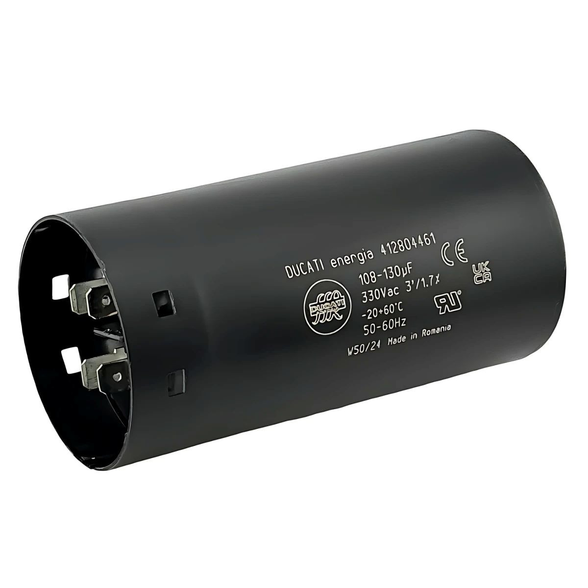 Without bracket and cap. 108-130µF. Dimensions: Ø52x105mm. 330V, ~3'/1.7%, -10+55°C, 50/60Hz.