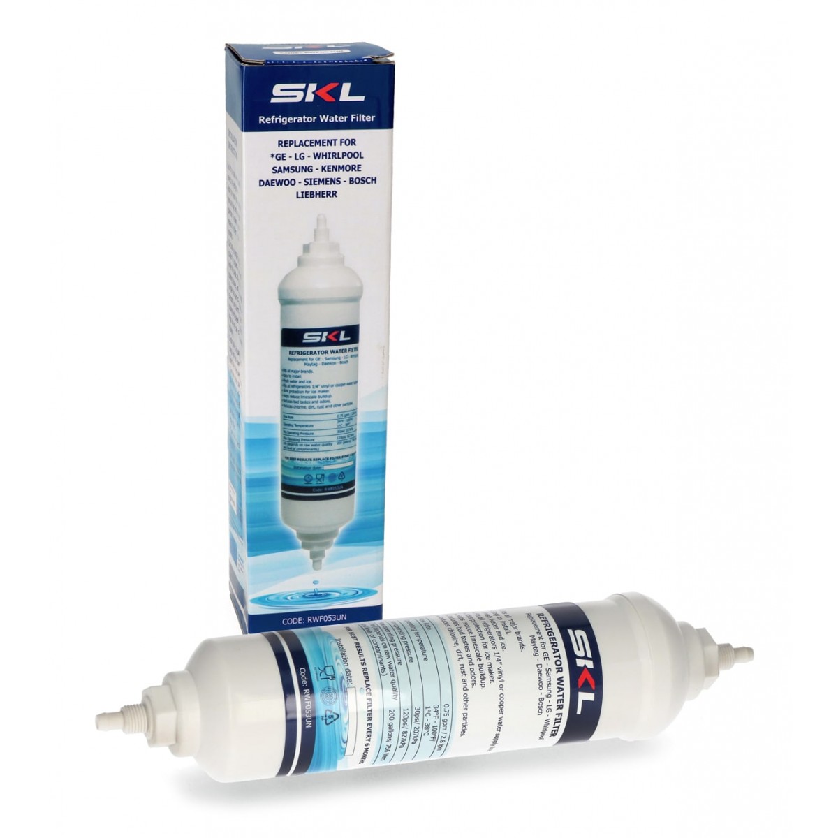 EXTERNAL WATER FILTER FOR REFRIGERATOR. OPERATING TEMPERATURE: 1-38°C. PRESSURE: 30/120PSI/207-827KPA. FLOW RATE: 0.75GPM=2.8LPM. FILTRATION LIFE: 6 MONTHS, 756 LT.